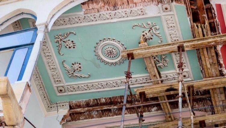 (פיגומים תומכים בתקרה סדוקה של בית לבנוני בביירות אחרי הפיצוץ בנמל, תחילת אוגוסט 2020)