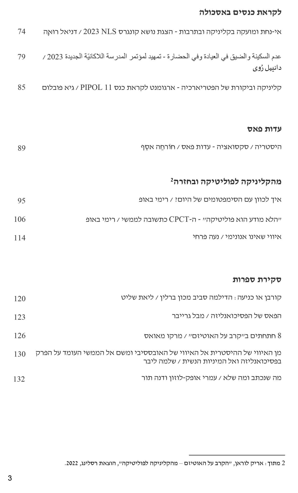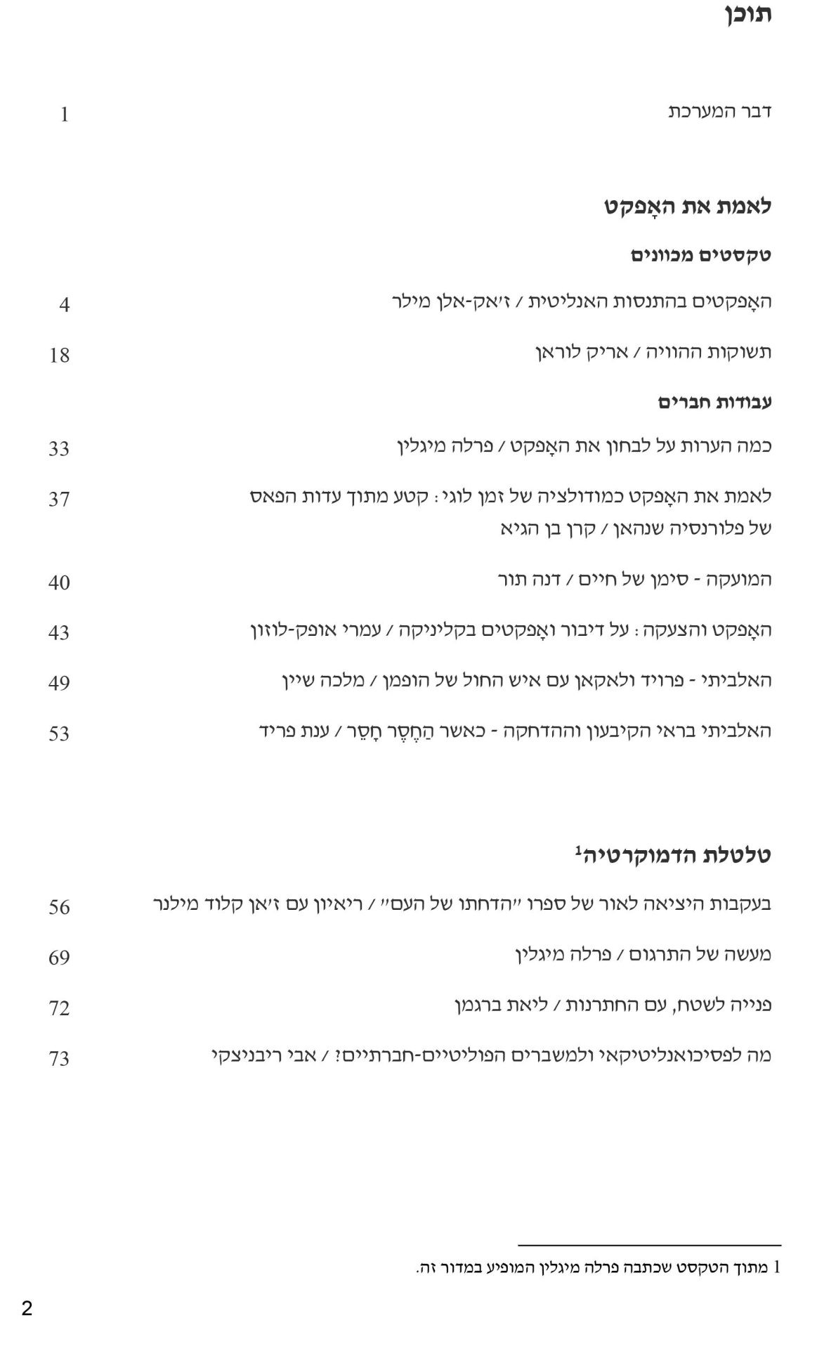“זמן שברירי, ההסכמות העדינות עליהן הוקמה המדינה רועדות. קיטוב ושיסוע סביב. איך יוצאים מהמשבר מבלי שתהיה ידו של האחד על העליונה? הסכמות חדשות? פשרות? העתיד לוט בערפל. באיזה אופן הפסיכואנליזה יכולה להיות עבורנו מצפן ולאפשר לנו לקרוא את הרגע הנוכחי? כמו עם כל גיליון, התחלנו לעבוד על זה הנוכחי מיד לאחר ההוצאה של קודמו, באביב שעבר. כעת אנחנו שכותרתו “אי נחת ומועקה בקליניקה ובתרבות”. רוחב היריעה שנושא זה NLS בפתחו של כנס מכתיב, האקטואליות התמידית שלו, ממקמת את הגיליון תחת התנועה של נושא זה, הפעם עם כותרת שהציעה לנו פרלה מיגלין שליוותה אותנו כעורכת אורחת, “לאמת את האָפקט”. החלק Et בגיליון שמוקדש לנושא זה כולל תרגומים ועבודות מקוריות והוא תוצר של עבודתה של מערכת לאקאן במרחב הג’יאפ.”